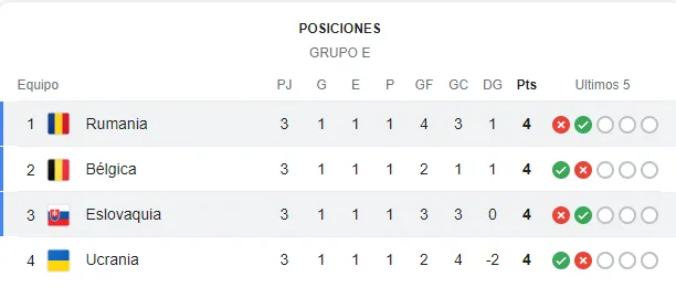 Lamentablemente para Ucrania, pese a tener la misma cantidad de puntos que todos sus rivales, contaba con una diferencia de gol de -2, mientras que el líder Rumania, tenía +1 (al igual que Bélgica, pero con 3 goles a favor).