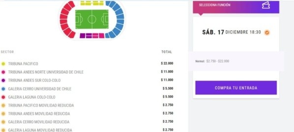 Los valores fluctúan entre los 22 mil pesos la tribuna pacífico, 11 mil pesos tribuna andes, 5.500 galería y 2750 pesos para tribuna pacífico, tribuna andes y galerías en movilidad reducida.