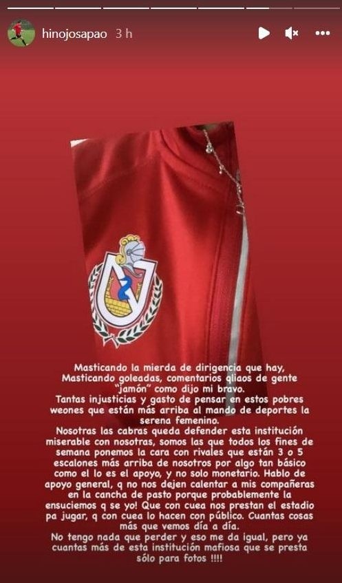 A través de sus redes sociales se refirió a las condiciones precarias con las que trabaja junto a sus compañeras y apuntó fuerte a los directivos papayeros. “Masticando la mierda de dirigencia que hay, masticando goleadas, comentarios de gente ‘jamón’ como dijo Claudio Bravo. Tantas injusticias y gastos de pensar en estos pobres weones que están más arriba al mando de Deportes La Serena”, lanzó.