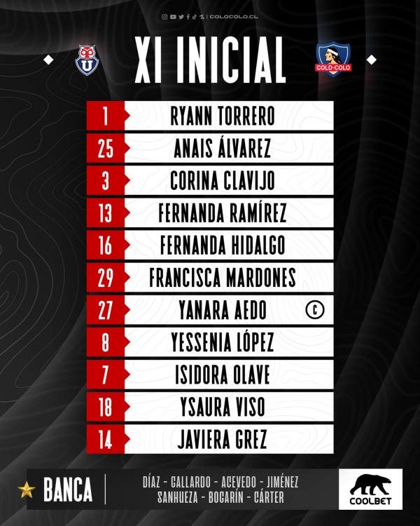 Para este duelo, Colo Colo partirá con la portera Ryan Torrero, quien llegó a fortalecer la portería de las albas y se ganó su espacio con buenos partidos durante la actual campaña en el FutFem 2023. Además, Luis Mena repite a la misma formación que viene de ganar por 5-0 a la Universidad Católica.