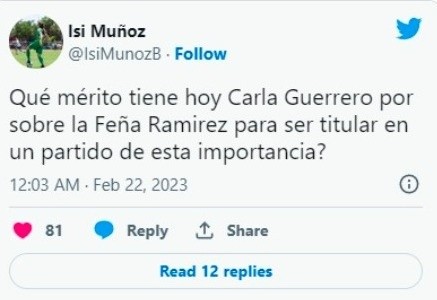 Isidora Muñoz, volante del cuadro audino, se volcó a sus Redes Sociales para encender la polémica y barrer el piso con la seleccionada nacional: “¿Qué mérito tiene hoy Carla Guerrero por sobre la Feña Ramírez para ser titular en un partido de esta importancia?”, dijo.