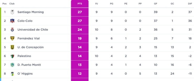 La victoria de Colo Colo le permite estar al tope de la tabla de posiciones junto a Santiago Morning con 27 puntos, aunque las microbuseras ostentan mejor diferencia de gol. Universidad de Chile, por otro lado, quedó en el tercer lugar con 24 unidades y un partido más que las dos líderes.