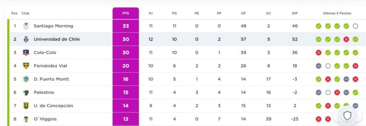 Tras el triunfo de Universidad de Chile ante O'Higgins y la victoria de Santiago Morning ante Colo Colo en el clásico del fútbol femenino, la tabla quedó más estrecha que nunca con el Chago como exclusivo líder. Albas y azules comparten el subliderato.
