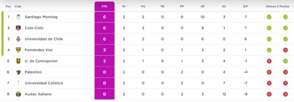 Santiago Morning, Colo Colo y Universidad de Chile son las líderes de la competencia con seis puntos, mientras que Palestino, Universidad Católica y el Audax comienzan a quedarse en el fondo sin unidades todavía.