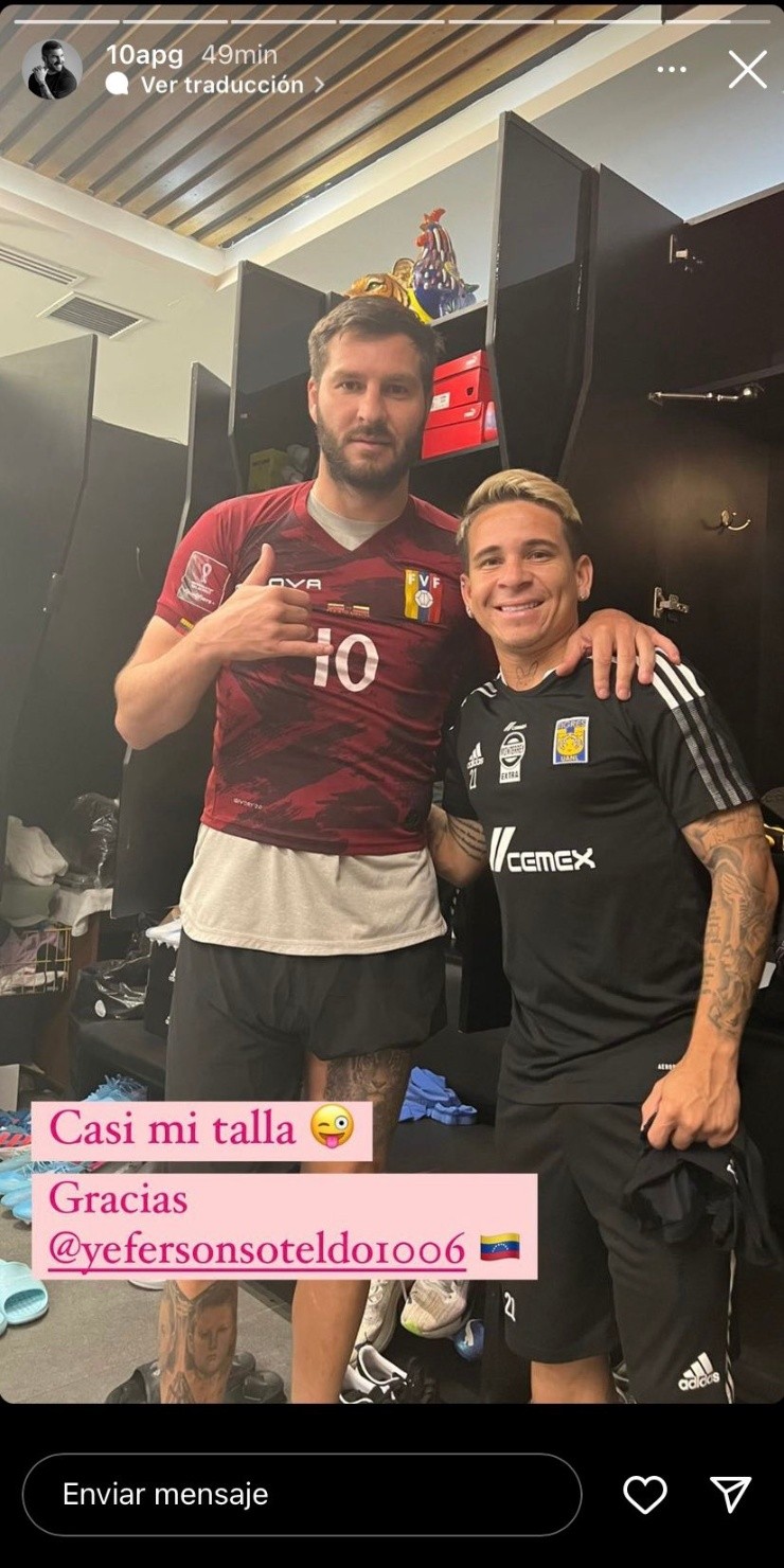 Gignac aprovechó las redes sociales para trolear a Soteldo producto de que la camiseta del venezolano era muy pequeña, pero que no tardó en ponérsela para dar a conocer que no eran la misma talla. “Casi mi talla, gracias”, escribió el francés en las plataformas digitales.