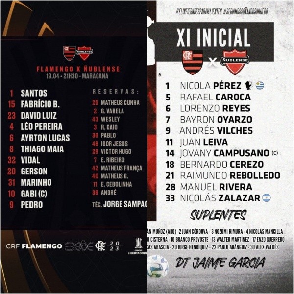 Las formaciones de ambos equipos (Twitter Flamengo y Ñublense )