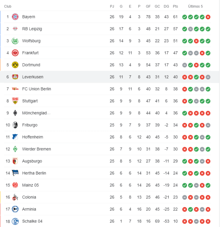 Tabla de posiciones en la Bundesliga.
