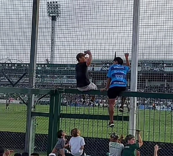 Un hincha aprovechó toda la pasión para colgarse del alambrado en el recinto de Junín. Eso, de inmediato, fue advertido por todo el público presente y también por el locutor oficial de Sarmiento. Sin embargo, el profesional no fue del todo atinado.