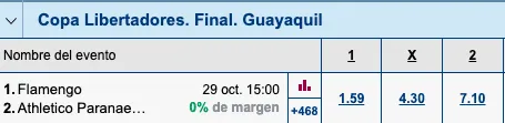 En Marathonbet tienes más de 100 opcionespara jugar con la final de la Copa Libertadores. La cuota de Flamengo para ganar el partido en los 90 minutos, paga 1.59 veces lo que juegues. Esta cuota tiene un margen amplio con la de Athletico Paranaense, la cual paga 7.10 veces lo que juegues.