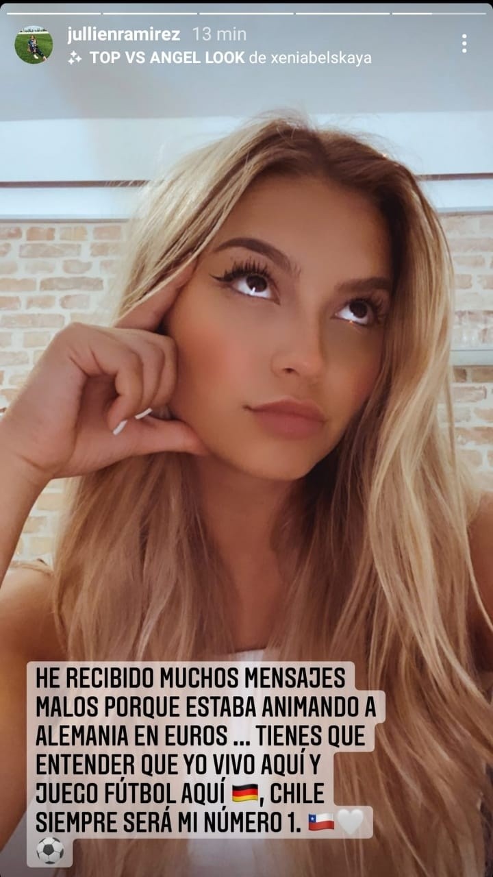 Tras consumarse la derrota y eliminación de Alemania en la Euro, Ramírez subió una historia en su Instagram que dice: “He recibido muchos mensajes malos porque estaba animando a Alemania en Euro… tienes que entender que yo vivo aquí y juego fútbol aquí, Chile siempre será mi número 1”, expresó.