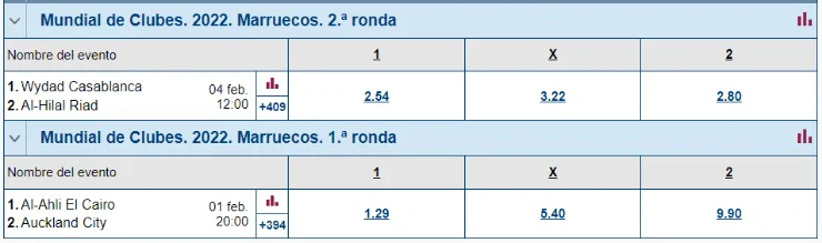 Para el segundo encuentro, Marathonbet te cuenta que el favorito para ganar es Wydad Casablanca, que paga 2,54 veces lo que juegues, por sobre los 2,80 que paga Al-Hilal por su triunfo. Ahora, si crees que termina en empate en el tiempo regular, paga 3,22 veces lo que apuestes.
