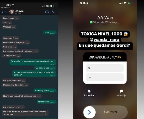 Luego, la situación siguió adelante y en la última historia, que luego borró de su cuenta, Icardi escribió “tóxica nivel 1000, Wanda Nara. En qué quedamos gordi?”. Además, junto con la llamada de video, el ex amigo de Maxi López publicó en la misma historia con una encuesta: “¿Estará soltera o no?”.