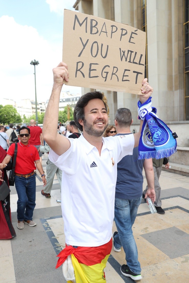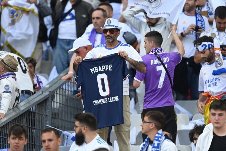 En la previa a la final que disputará el Real Madrid ante el Liverpool en Francia, los hinchas del conjunto madrileño no dudaron en tocarle las orejas al Mbappé en su propio país, en donde dentro del Stade de France, un fanatico en particular dedicó una especial camiseta para la estrella del PSG.