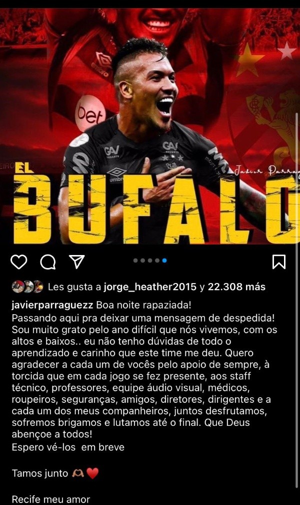Quiero agradecer a cada uno de ustedes por el apoyo como siempre, a los fans que en cada partido estuvieron presentes, al personal coaching, maestros, equipo de audio visual, doctores, armario, guardias de seguridad, amigos, directores, y cada uno de mis compañeros, juntos lo disfrutamos, sufrió, luchó y luchó hasta el final. ¡Dios los bendiga a todos! Espero verte pronto. Recife mi amor“, finalizó el ‘Búfalo’.