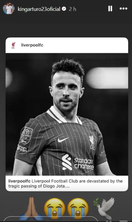 Tanto el “King” como el “Pitbull” subieron a sus historias de Instagram una imagen de Jota, acompañada de tres emojis que lo decían todo: Una oración, una cara llorando y una paloma blanca con una rama de olivo. Un gesto de respeto profundo hacia un colega del fútbol.