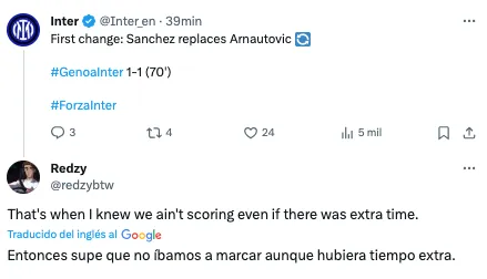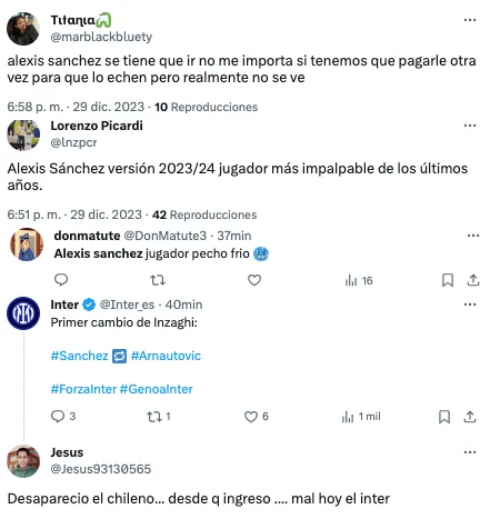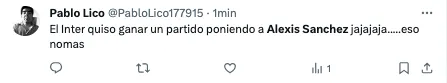 Más ganas que fútbol y que en redes sociales los hinchas del Inter hicieron pebre al chileno. “Desaparecido”, “Jugador pecho frío” y “Se tiene que ir”, fueron parte de los comentarios que se dejaron ver en Twitter, ahora conocido como ‘X’.