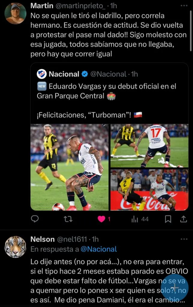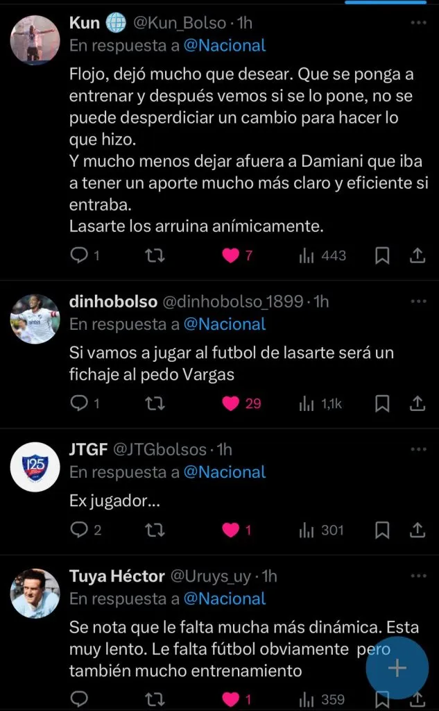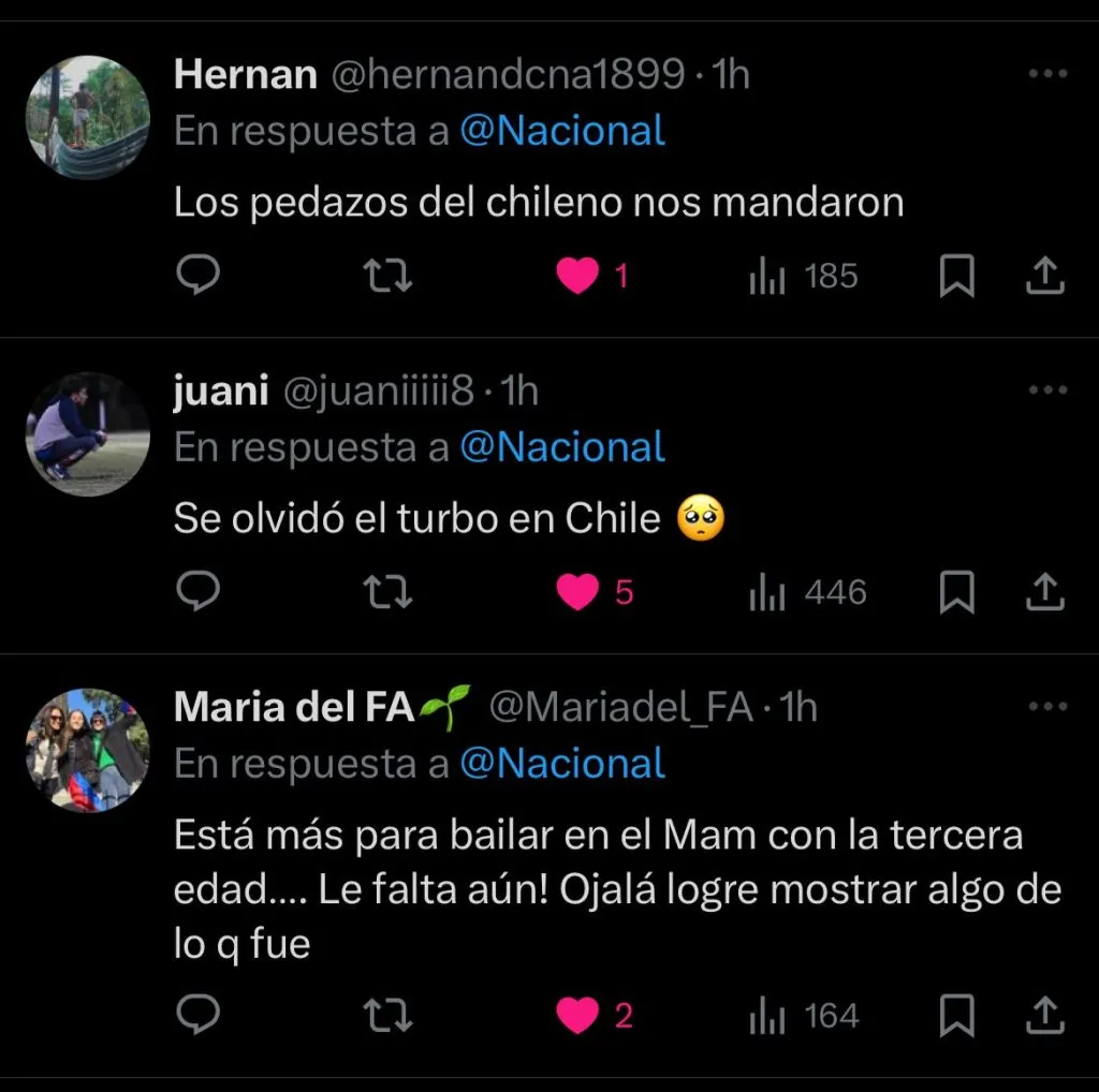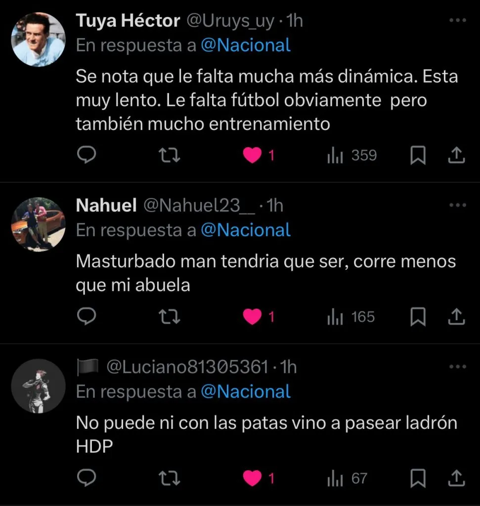 En esta jornada, desde la cuenta de Nacional en ‘X’, felicitaron al jugador nacional por lo que fue su debut con la camiseta del ‘Bolso’ en el partido ante Peñarol, en la que los hinchas de forma inmediata comenzaron a dejar sus comentarios de desaprobación.