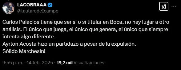 “Carlos Palacios tiene que ser si o si titular en Boca, no hay lugar a otro análisis. El único que juega, el único que genera, el único que siempre intenta algo diferente”, escribió en la ex red social del pajarito.