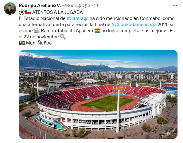Así lo asegura el periodista Rodrigo Arellano a través de su cuenta de X: “El Estadio Nacional de #Santiago ha sido mencionado en Conmebol como una alternativa fuerte para recibir la final de #CopaSudamericana 2025 si es que el Ramón Tahuichi Aguilera no logra completar sus mejoras. Es el 22 de noviembre”.