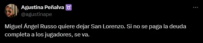 “Miguel Ángel Russo quiere dejar San Lorenzo. Si no se paga la deuda completa a los jugadores, se va”, afirmó la periodista Agustina Peñalva de Fox Sports Argentina en su cuenta de X.