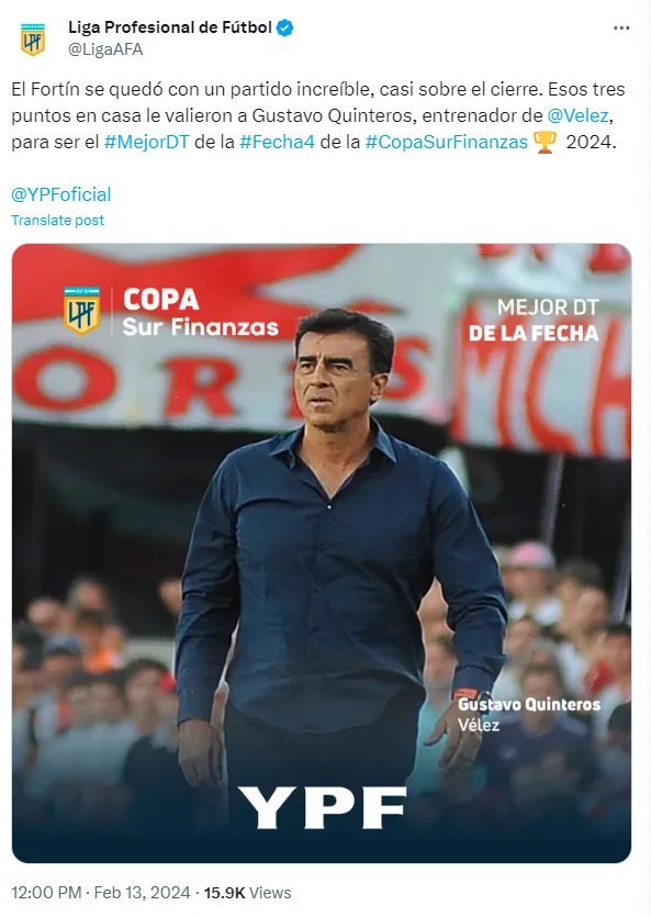 “El Fortín se quedó con un partido increíble, casi sobre el cierre. Esos tres puntos le valieron a Gustavo Quinteros, entrenador de Vélez para ser el mejor DT de la fecha 4”, comunicaron a través de la cuenta oficial de la Liga Profesional de Fútbol.