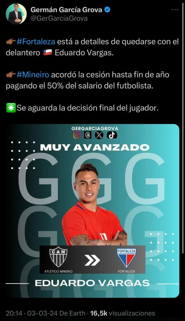 “Fortaleza está a detalles de quedarse con el delantero Eduardo Vargas. Atlético Mineiro acordó la cesión hasta fin de año pagando el 50% del salario del futbolista. Se aguarda la decisión final del jugador”, señaló el comunicador.
