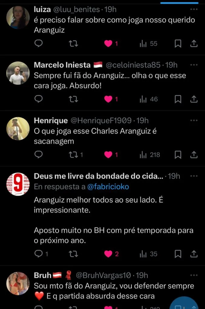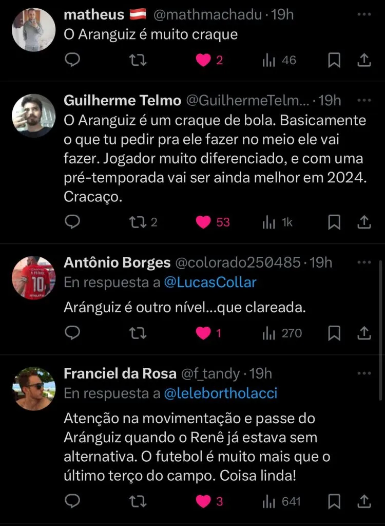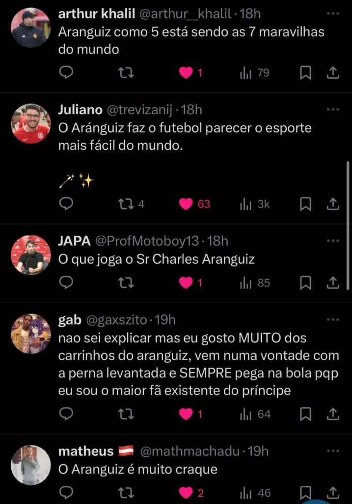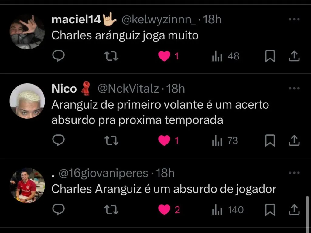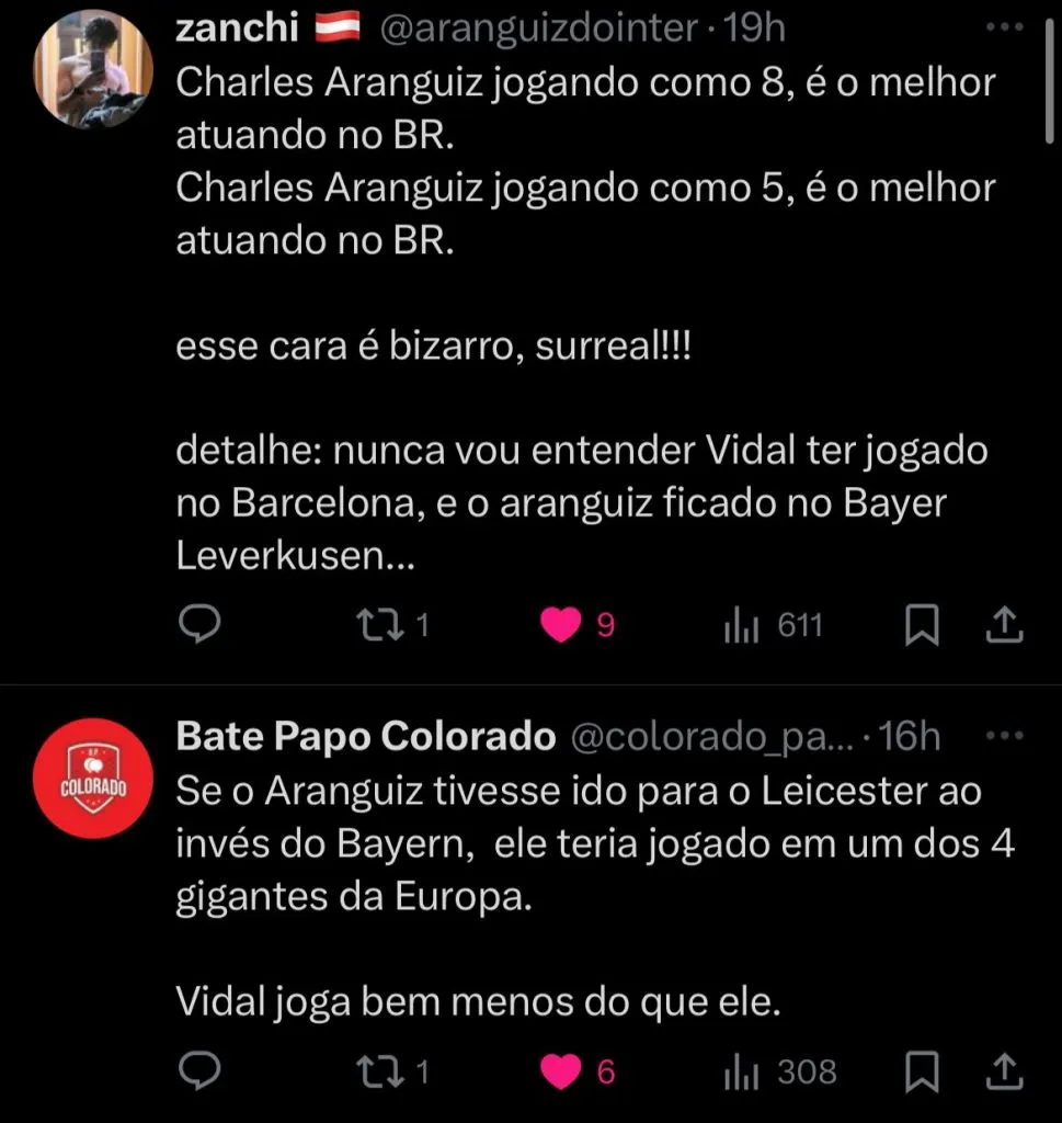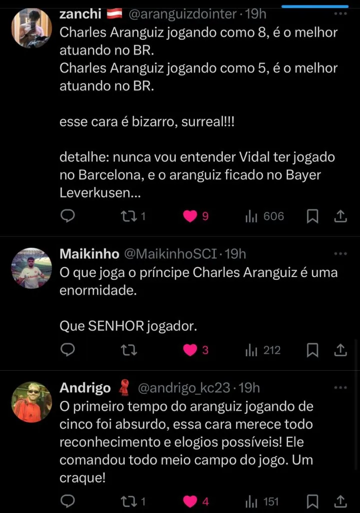 Dentro de lo que fueron estas grandes palabras, algunos de los hinchas del Internacional de Porto Alegre hicieron una brutal comparación entre Charles Aránguiz y otro histórico nacional, Arturo Vidal.