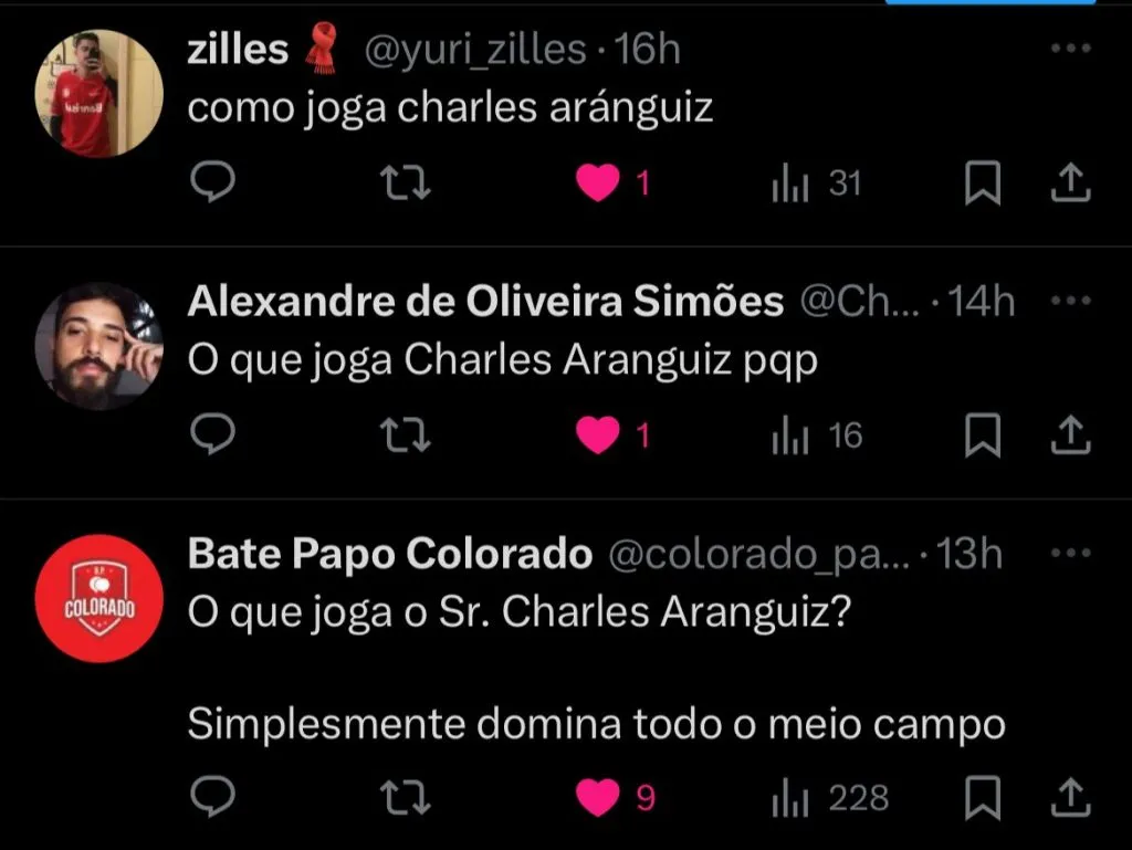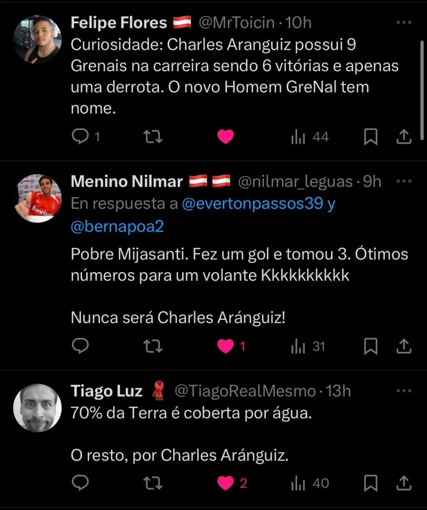 Los fanáticos del conjunto brasileño se apostaron principalmente a la red social de ‘X’ para llenar en elogios a lo que fue el partido que disputó Aránguiz en el clásico ante Gremio, en la que lo glorificaron por su desempeño.