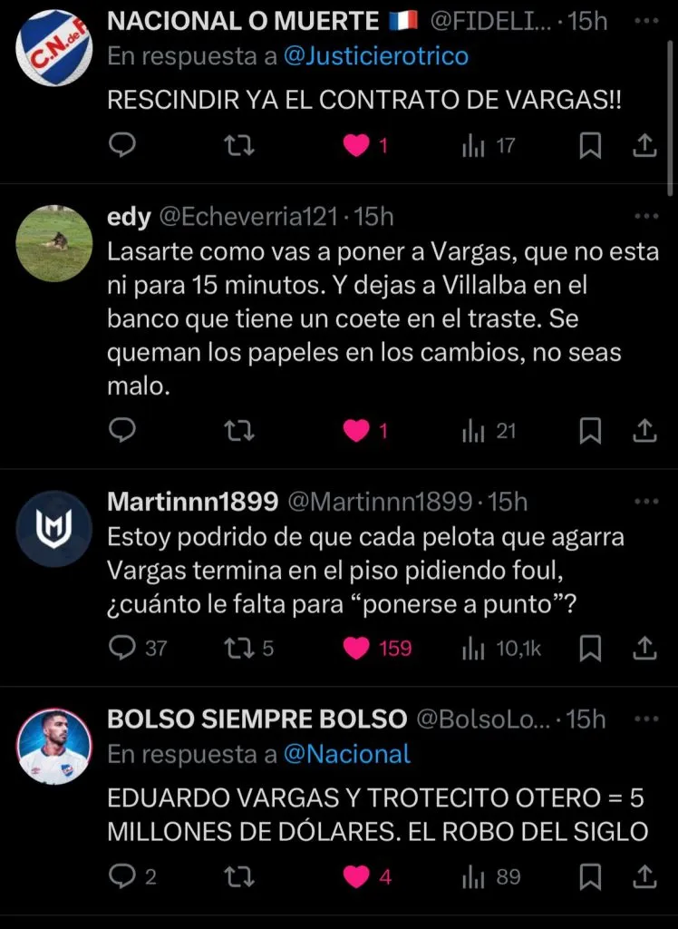 “Estoy podrido de que cada pelota que agarra Vargas termina en el piso pidiendo foul. ¿Cuánto le falta para ‘ponerse a punto’?”. concluyó otro fanático.