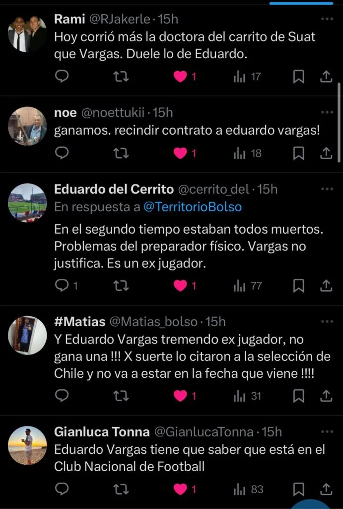 “Eduardo Vargas tremendo ex jugador, no gana una!! por suerte lo citaron a la selección de Chile y no va estar en la fecha que viene”, señaló un hincha.