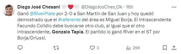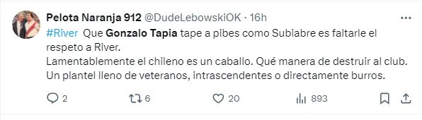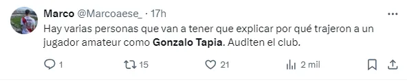 La bronca de los hinchas fue tal que incluso le enrostraron lo que fue su paso por el cuadro de la precordillera: “Gonzalo Tapia ROTABA en UNIVERSIDAD CATOLICA, era tan intrascendente que LO DEJARON LIBRE, tenía una oferta de un equipo de la SEGUNDA DE BRASIL para irse GRATIS y River se metió y PAGO UN PALO VERDE!!! por BUENA VOLUNTAD”.