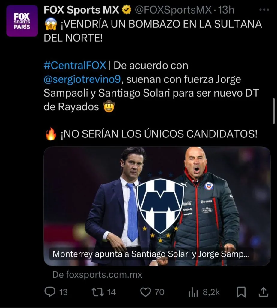 Según informó Fox Sports México, el conjunto mexicano tiene como uno de sus grandes candidatos al estratega argentino y los próximos días podrían ser claves para saber quien será el nuevo DT de Monterrey.