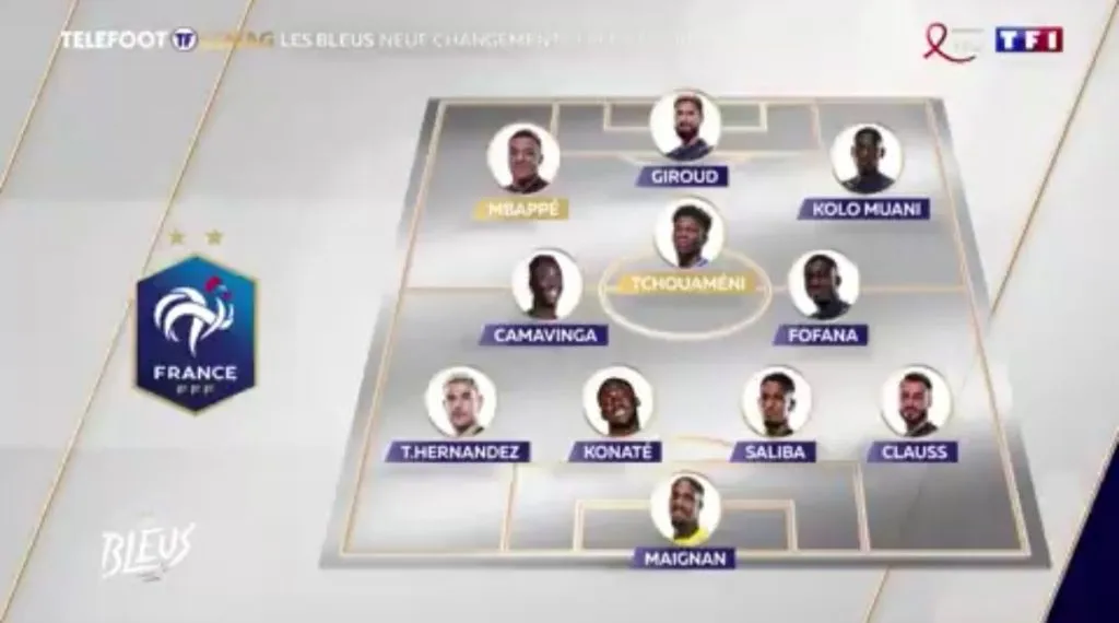 La formación que la Selección de Francia prepara ante Chile es con: Mike Maignan en portería; Jonathan Clauss, William Saliba, Ibrahima Konaté y Theo Hernández en la defensa; Eduardo Camavinga, Youssouf Fofana y Aurélien Tchouaméni en el mediocampo; Randal Kolo Muani, Olivier Giroud y Kylian Mbappé en el ataque.