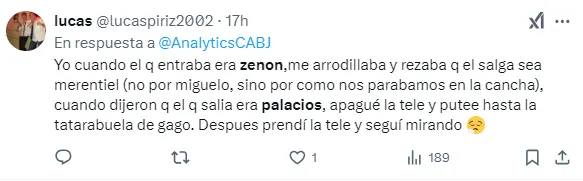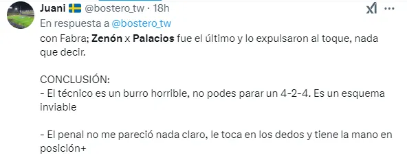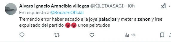Parte de los comentarios de la parcialidad de Boca, aseguró en su mayoría que: “El doble 5 a 50km de los de adelante, Palacios no tiene con quien jugar, cambio Barinaga que venia en partido por el negrito limitado, Zenón que te deja a gamba, fabra sigue en consideración. Inentendible los caprichitos del técnico“.