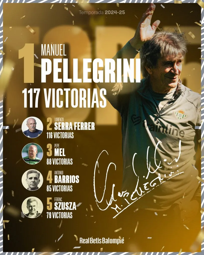 La cuenta oficial del Betis informó que Manuel Pellegrini se convirtió en el entrenador con más triunfos en el cuadro verderón con 117 superando a Lorenzo Sera Ferrer que tenía 116.