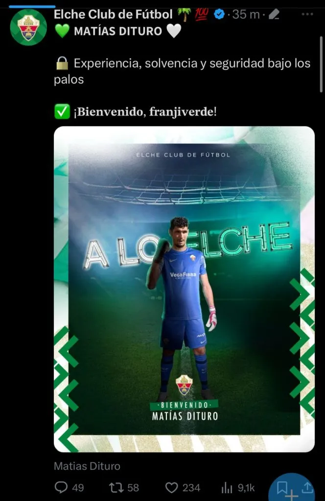 “Matías Dituro, Experiencia, solvencia y seguridad bajo los palos. ¡Bienvenido, franjiverde!”, fue como lo presentaron en las redes de su nuevo club.