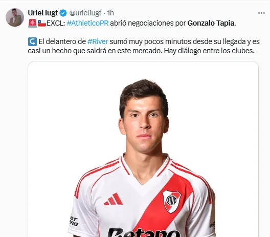 “Exclusivo: Athletico PR abrió negociaciones por Gonzalo Tapia. El delantero de River Plate sumó muy pocos minutos desde su llegada y es casi un hecho que saldrá en este mercado. Hay diálogo entre los clubes”, declaró.