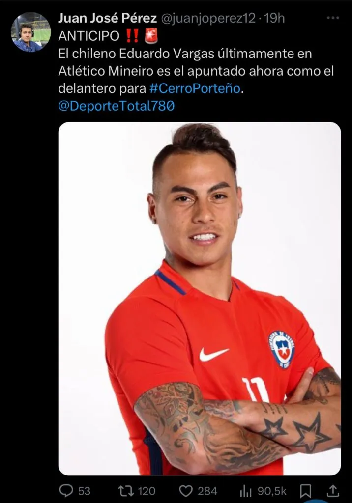 “Anticipo. El chileno Eduardo Vargas últimamente en Atlético Mineiro es el apuntado ahora como el delantero para Cerro Porteño“, declaró.