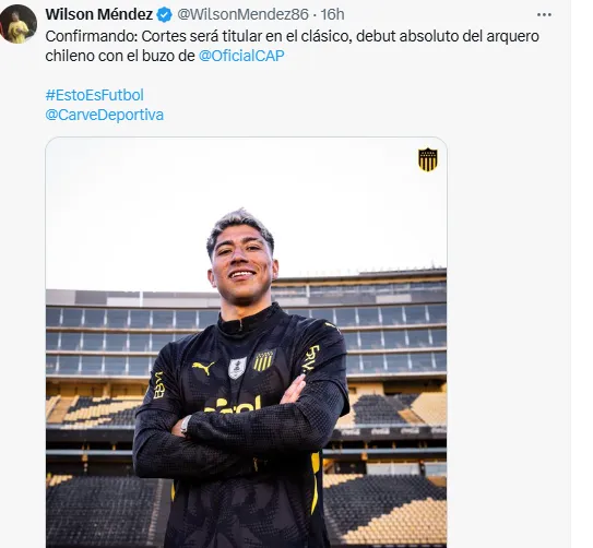 “Confirmando: Cortés será titular en el clásico, debut absoluto del arquero chileno con el buzo de Peñarol”, declaró.
