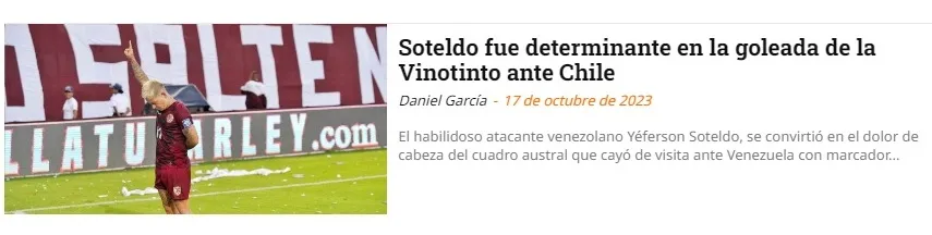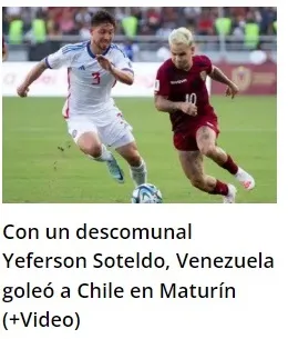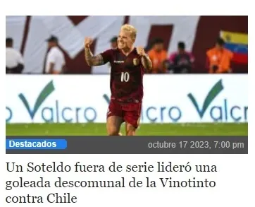 Finalmente, Noticia al Día, publica en su edición “Soteldo fue determinante en la goleada de la Vinotinto ante Chile“, dando realce que el pequeño rubio, fue el jugador más trascendente del duelo.