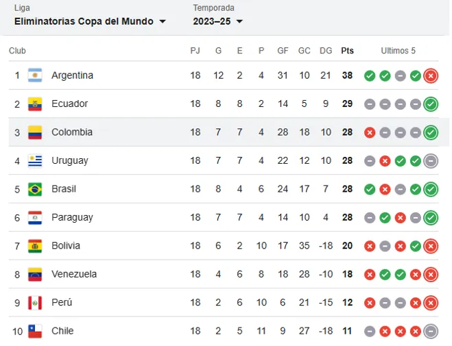 En resumen: Argentina, Ecuador, Colombia, Uruguay, Brasil y Paraguay (en ese orden) pasan directo al Mundial 2026. En tanto, Bolivia logró dar el batacazo y vencer al “Scratch” para meterse en el repechaje.