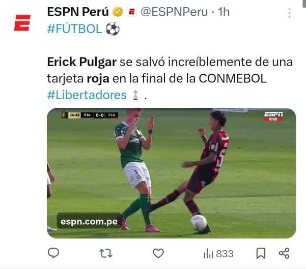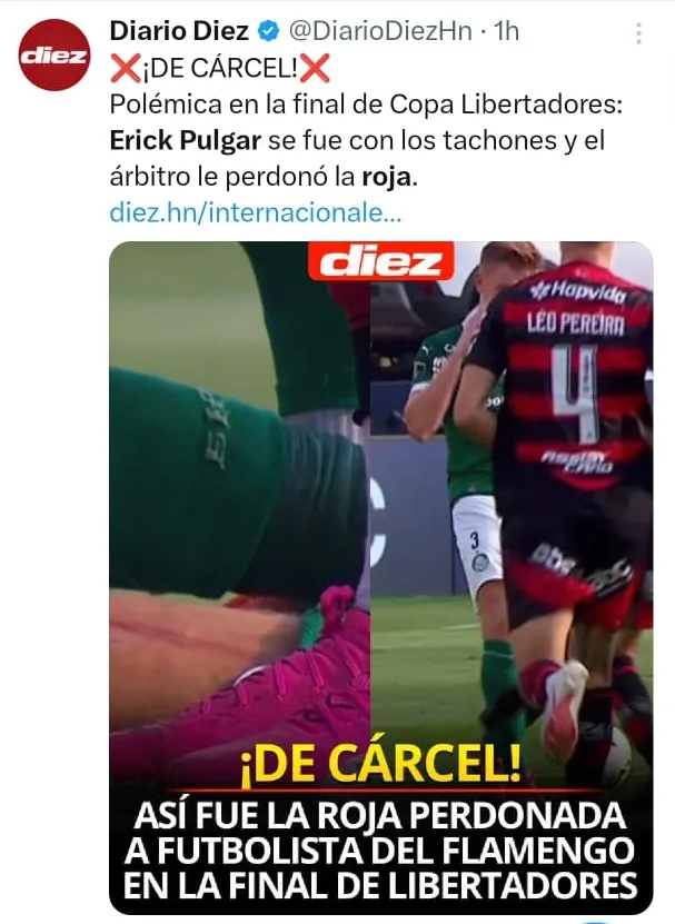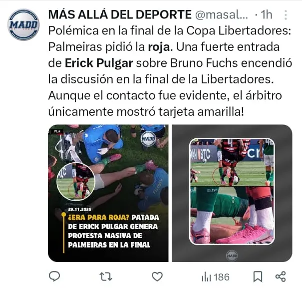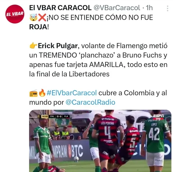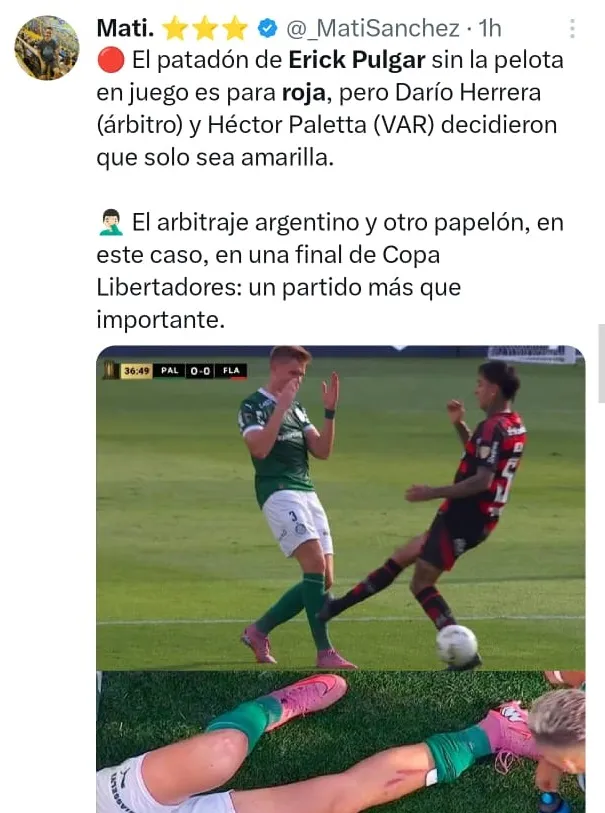 - Erick Pulgar generó indignación continental al meter un duro planchazo al defensor de Palmeiras, Bruno Fuchs, sin ser expulsado.