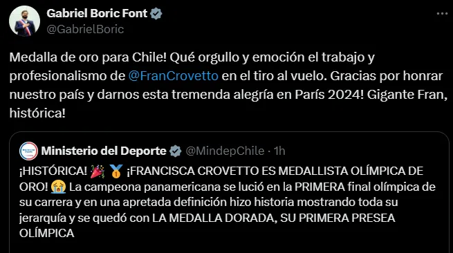 El Presidente de la República, Gabriel Boric, reaccionó a través de su cuenta de X (Ex Twitter) a la medalla de oro de la oriunda de San Miguel.