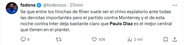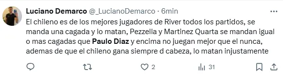 “Jugadores como Paulo Díaz me hacen prender la tele, donde su único defecto es que es “mufa” según algunos burros. Por lejos el mejor de River junto Acuña, ojalá no se vaya nunca. Te voy a amar hasta que me muera, Paulo César Díaz Huincales”, dijo uno de los internautas defendiendo al chileno.