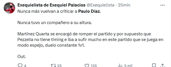 Hasta Carlitos Palacios salió al baile en uno de los comentarios: “Paulo Díaz ha jugado un partidazo, y junto a Acuña son los que han evitado una masacre del Inter. Los que lo critican no saben de fútbol. Critiquen a Martínez Quarta, ese si es un pelotudo. (Mastauntono desapareció peor que Palacios y apuesto no pasa nada, al otro lo destruyeron)“, aseguraron.