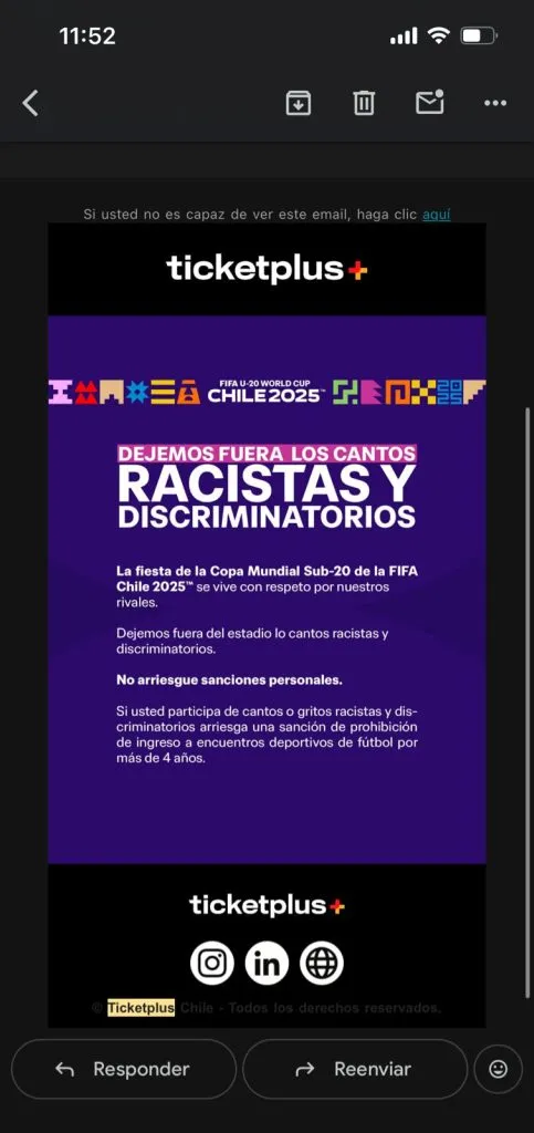 “La fiesta de la Copa Mundial Sub 20 de la FIFA Chile 2025 se vive con respeto por nuestros rivales. Dejemos fuera del estadio los cantos racistas y discriminatorios”, expresó Ticketplus en el incio de su comunicado.