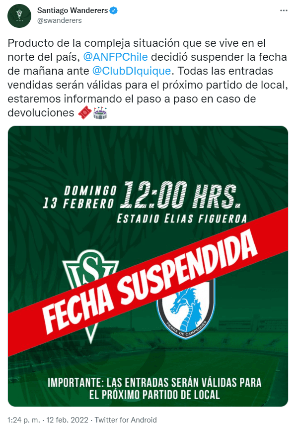 “Producto de la compleja situación que se vive en el norte del país, ANFP decidió suspender la fecha de mañana ante Deportes Iquique. Todas las entradas vendidas serán válidas para el próximo partido de local, estaremos informando el paso a paso en caso de devoluciones”, informó el elenco wanderino.