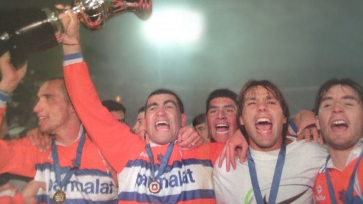 Beto Acosta celebrando el título que ganó con Católica, precisamente, a Colo Colo