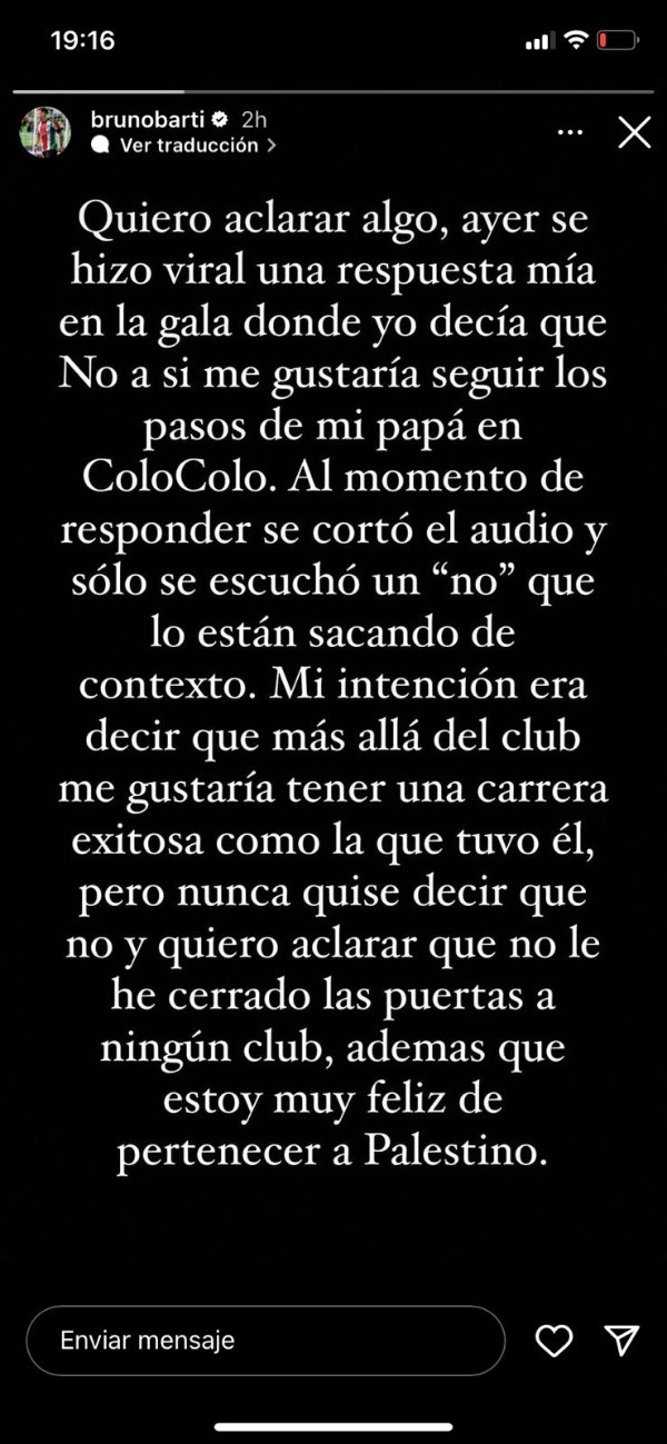 “Quiero aclarar algo, ayer se hizo viral una respuesta mía en la gala donde yo decía que ‘No’ a si me gustaría seguir los pasos de mi papá en Colo Colo. Al momento de responder se cortó el audio y solo se escuchó un no que lo están sacando de contexto”, partió expresando en su escrito el delantero.