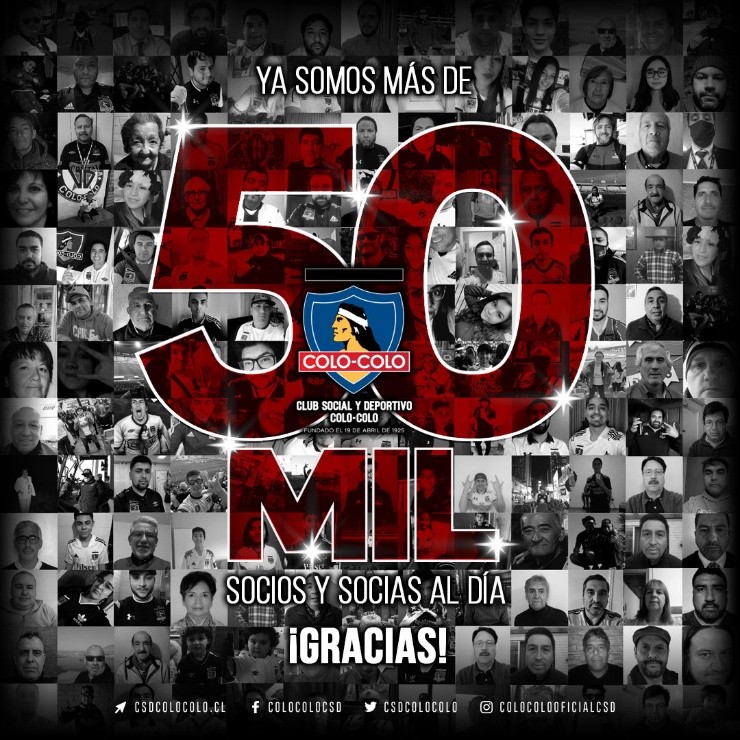 Mediante su cuenta de Twitter, el CSD Colo Colo informó a la opinión pública el alcance de un total de 50 mil socios al día, considerando que hace poco más de un año, estaba rondando por los diez mil.